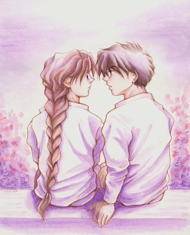 Another color practice, violet this time. When I hear "Violet" the first thing comes to my mind is Duo's eyes...so the vision came rather easily, Heero being enchanted by Duo's eyes |