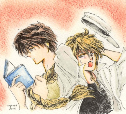 | Out of all things, this was inspired by special feature clip from movie "DOOM" DVD (firearm training of actors). Here is pencil sketch and ink version. | Wanted to try more subtle color scheme... It was supposed to be just Heero at first, but Duo just showed up! How did that happen? (^_^;) | ||||