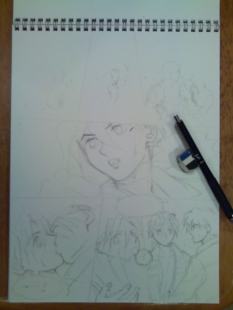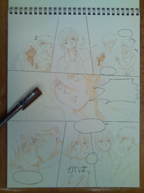 I normally start out with very very rough character figures and word bubbles in the each panel to make the overall layout, and start drawing out each panel. I try to draw starting from left to right in the same raw, simply because I am right handed and if I start drawing from right to left my hand will smear the pencil lines all over (^o^;) I can avoid it by just placing clean white paper over the finished draft panels but most of the time I don't have the paper handy within my reach so I just do what's convenient for the time being (^o^;)I tend to draw close-ups that kind of define the mood of the page first and fill the rest of smaller people panels.I guess it's just a habit of mine... (^_^)